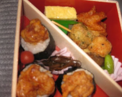 冒頭の写真が買った天むすで、下が花小箱のお弁当です。どちらも車の中で撮ってるのでうまく撮れていませんがご了承ください。