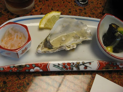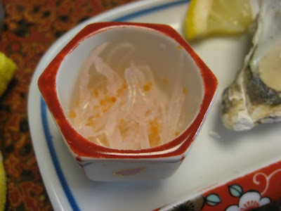 順番は逆になりますが、付き出しです。真ん中がかき、右はなす、左はさめの軟骨だそうです。このさめの軟骨、なかなかの美味でした。こりこりで食感がとても良かったです。また食べたい一品です。