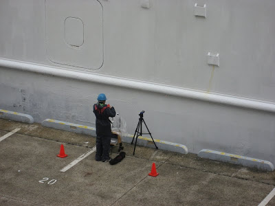 接岸する際に、桟橋側で計測器で何か測っているような方がおられました。